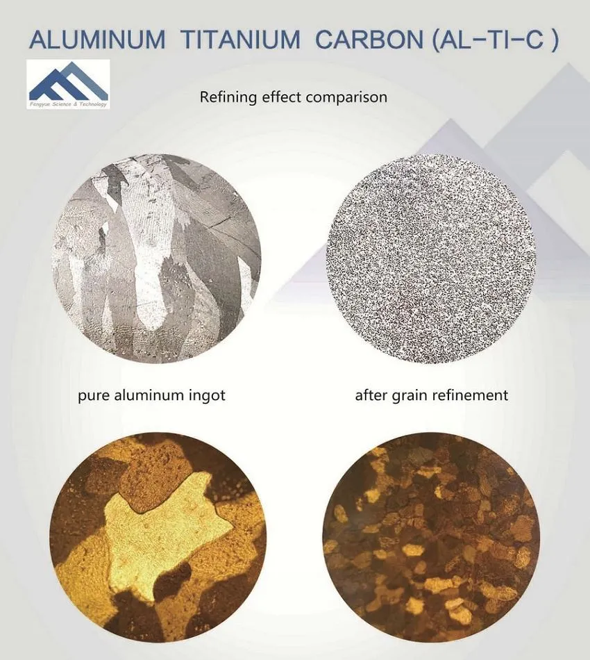 Trí thaighde gan staonadh a rinne taighdeoir ár gcuideachta, chomhoibrigh sé le hinstitiúid taighde cóimhiotail éadroma CSU (ollscoil lárnach ó dheas), bunaithe ar phaitinn 4873054 # USA, d’éirigh lenár gcuideachta sa deireadh scagaire gráin alúmanaim Al-Ti-C a tháirgeadh, is é sin i bhfad níos fearr ná an scagaire gráin Al-Ti-B den chéad ghrád is fearr. Tá a éifeacht scagtha inchomparáide leis an táirge céanna san Eoraip agus a rinneadh i Meiriceá, nó níos fearr fós. Sainmhínítear ár gcomhpháirteanna cóimhiotail go príomha ina dhá chineál: Al-5Ti- (0.1 ~ 0.5) C, Al-3Ti- (0.1 ~ 0.3) C. Trí thurgnaimh arís agus arís eile, tá úinéireacht ag ár scagaire gráin Al-Ti-C ar ár dtáirge buntáistí seachtracha, mar mhaoin chobhsaí, fad éifeachtach den scoth (cumas frith-mhaolaithe), féadann sé a dhéanamh go bhfaighidh na táirgí alúmanam criostail isiméadrach níos mín, féadann sé na lochtanna coitianta a bhaineann le táirgí alúmanaim ar nós scáinte agus scaradh fuar a shárú, agus neart agus seasmhacht táirgí alúmanaim a fheabhsú go suntasach.